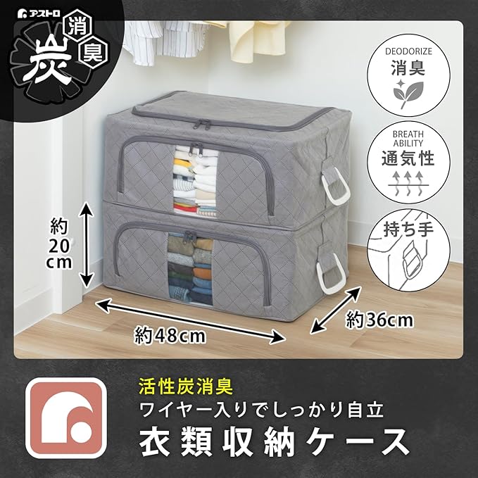 アストロ 活性炭消臭 ワイヤー入り 衣類収納ケース Mサイズ 1個 活性炭のチカラで消臭保管 ワイヤー入りで積み重ねて収納できる 上からも前からも出し入れできる 通気性の良い不織布がホコリなどの汚れをガード 3層構造の厚手生地 透明窓 持ち手 洋服 収納ボックス 衣装ケース 収納袋 クローゼット 押し入れ収納 グレー 620-32