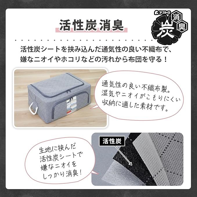 ●活性炭のチカラで消臭保管。活性炭シートがにおいをしっかり消臭。オフシーズンの衣類などをにおい・ホコリ・汚れからしっかり守る。