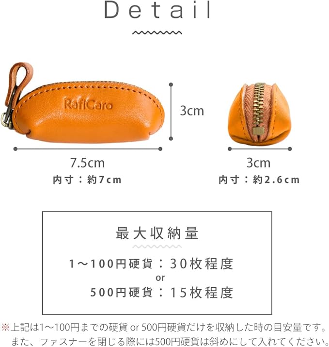 【スペック】 ・1円~100円硬貨:30枚程度 ・500円硬貨 15枚程度【サイズ】 ・縦 30mm 横 75mm 厚み 30mm ・重さ 15g【素材】 ・本革 イタリアンレザー