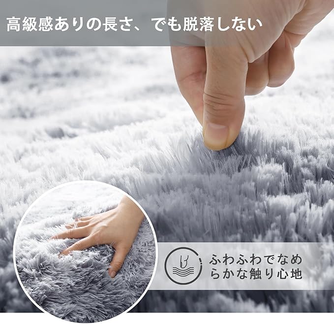 【長めの毛足・高級感あり】40mmの長い毛足で、しっとりなめらかな感触で気持ちいいシャギーラグです。ボリュームたっぷりのモフモフ感が魅力で、見た目も肌触りもよく、高級感にうっとり!また、100%極細繊維素材をしっかり裁縫されておるため、コロコロでも毛が抜けません。ゴミも絡みにくいので、日常掃除は掃除機をかけばキレイになります。さらに、お手入れ簡単で、手洗いまたは洗濯機で洗えます。
