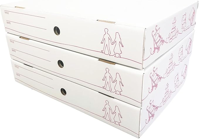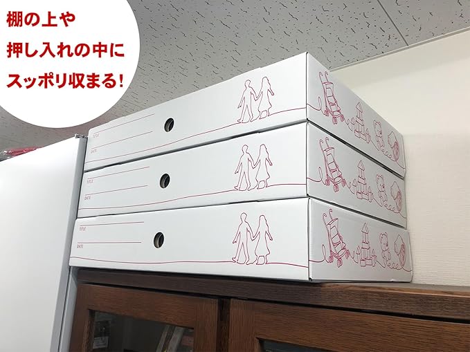 重ねて保管できるだけでなく、日付やタイトルが書けるので中に何が入っているのかも一目瞭然。大切な思い出をキレイに収納できます。