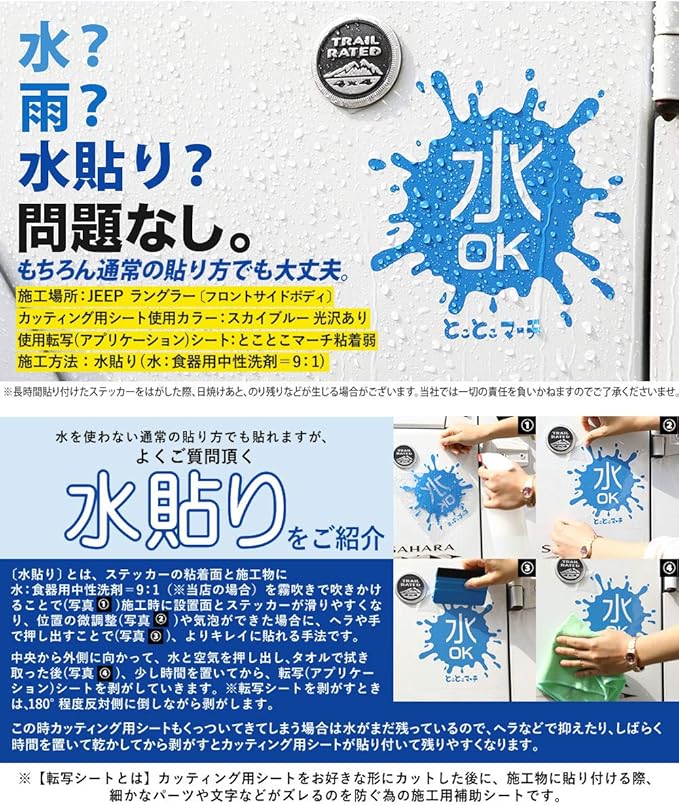 施工時、貼り付け、貼りはがしの際に発生するキズ、破損等につきましては当社では一切の責任を負いかねます。また、貼り付けたステッカーをはがした際に、日焼けあと、のり残りが生じる場合がありますが、当社では一切の責任を負いかねます。予めご了承ください。