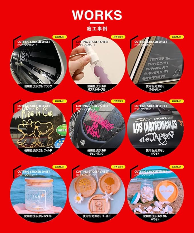 オリジナルステッカーが簡単に作れる、 便利なサイズカットされたカッティング用シートです。素材が薄いため、細かい文字や曲面がある図も作業がしやすいのがこちらのカッティング用シートの特徴です。 市販のカッティングマシン・カッティングブロッターを使用することができます。※カッティングマシンを使用される際は、カット圧など機械の設定調整など必要になりますので、テストカットを行ってから施工頂くことをお勧めしております。機械またはカット方法につきましては、お使いの機械メーカーの取扱説明書をご確認くださいませ。