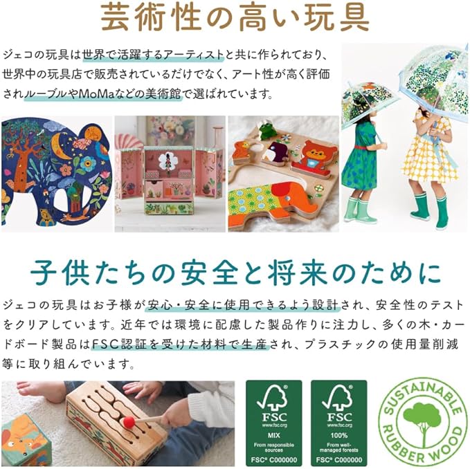 【 DJECO ジェコ】【フランスの老舗玩具ブランド】DJECO(ジェコ)は1954年設立のフランスの4大おもちゃメーカーのひとつ。海外の様々なアーティストと共同でユニークで夢のあるおもちゃや雑貨を制作しています。そのデザインはアート作品としても高い評価を得ており、これまでにヨーロッパのおもちゃ賞を数多く受賞、各国の美術館などでも販売されています。