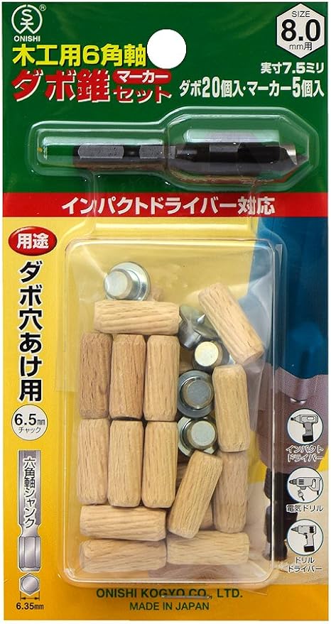 大西工業(Onishi Kogyo) 6角軸ダボ錐マーカーセット(NO.22MS) 8mm用セット セット内容=錐+木ダボ20個+マーカー5個