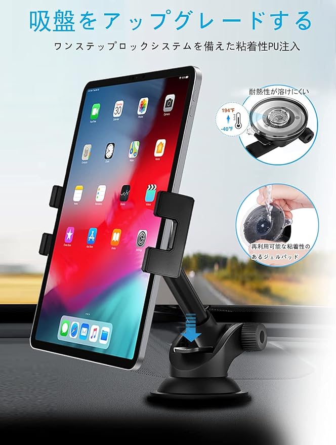 EXSHOW 車載ホルダー タブレットホルダー ダッシュボード 粘着ゲル吸盤式タブレットタブレットスタンド 強い吸引力サクションカップタブレットホルダー 伸縮可能チューブ フロンドガラス取り付けるipad車載ホルダー 360度回転 自由調節 日本語説明書付き タブレットとスマートフォン4~13インチ全機種対応 iPad Pro 9.7 11 12.9 インチ Air Mini/iPhone