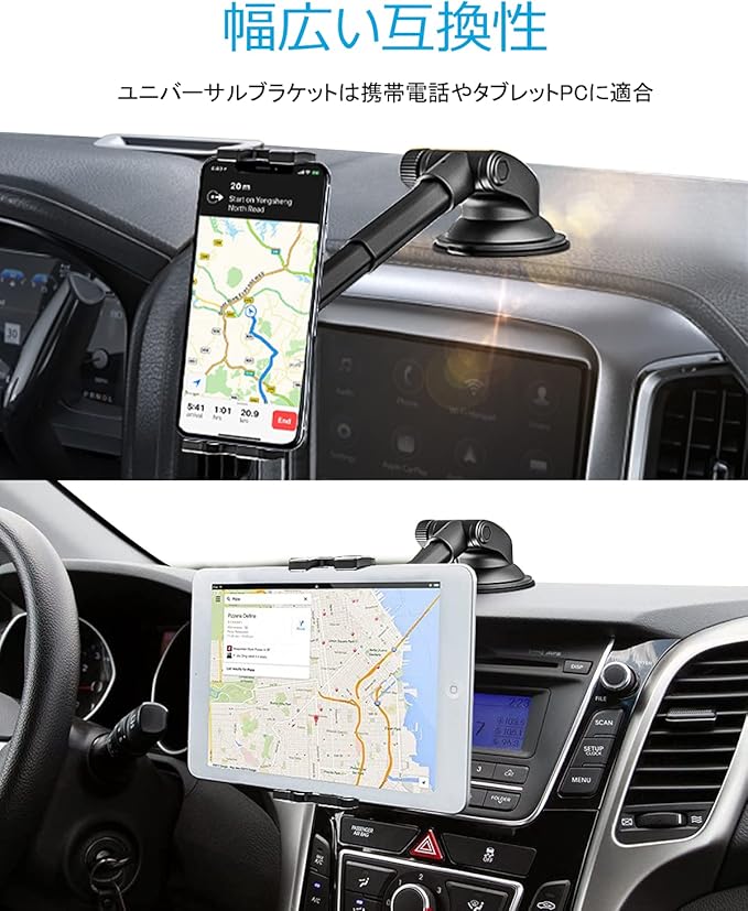 「多機種対応」車用のこのユニバーサルダッシュボードタブレットホルダー、調整可能なブラケットは幅119mmから260mmまで伸びます。全て4-13インチデバイスに向けます。対応タブレット:iPad Pro 9.7 / 10.5 / 11 / 12.9インチ、iPad Air 2、Air 3、Air 4、iPad Mini 1/2/3/4/5、iPad(第8世代)/7/6/5。対応携帯電話:iPhone 12、12Pro、12Pro Max、11 Pro Max、11 Pro、11、Xs Max、XR、XS、X、8 Plus、8、7 Plus、7、6 / Galaxy Tab / Galaxy Note / Galaxy S21、S20、S10 / Sony / Huawei。