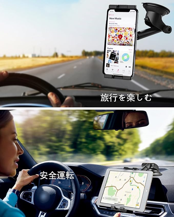 「超強力真空吸盤&吸着力何回でも復活」アップグレードされたワンステップロックシステムを備えた強力な吸盤は、携帯・タブレットをダッシュボードまたはフロントガラスに固定します。粘着性のあるPUインジェクションサクションカップベースは、サクションカップに空気が入らないようにし、ホルダーが緩んだり落下したりするのを防ぎます。この吸盤は何度も洗って再利用できます。