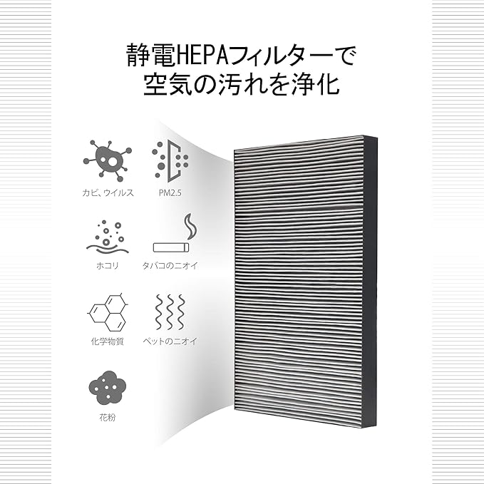 【製品機能】※集じん機能:花粉やアレル物質(ダニのフン・死骸)、ウイルス、カビ菌/ホコリ チリ、煙(粒子)、ペットの毛、トイレのにおい、生ゴミのにおい、ペットのにおいなどを捕集できます。 ※脱臭機能付き:ペット臭、トイレ臭などを脱臭できます。