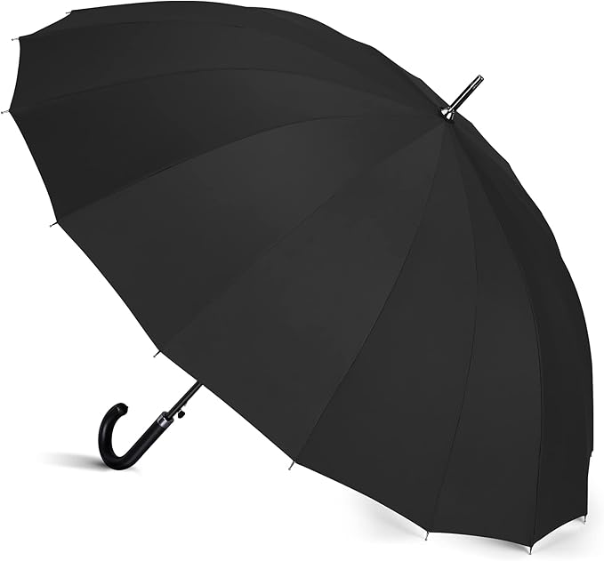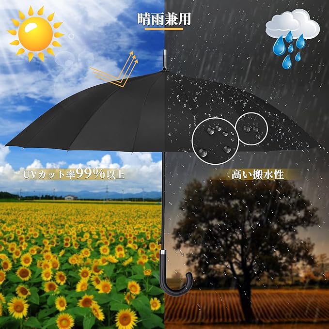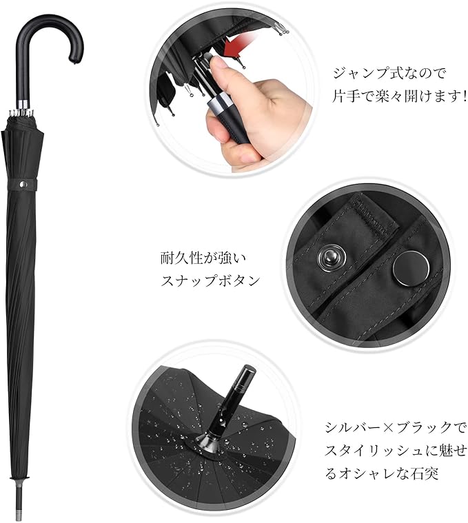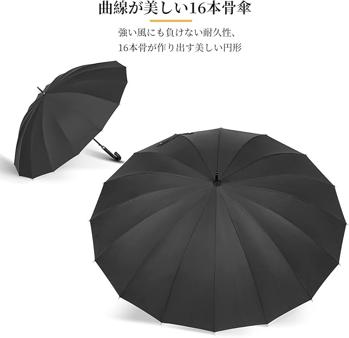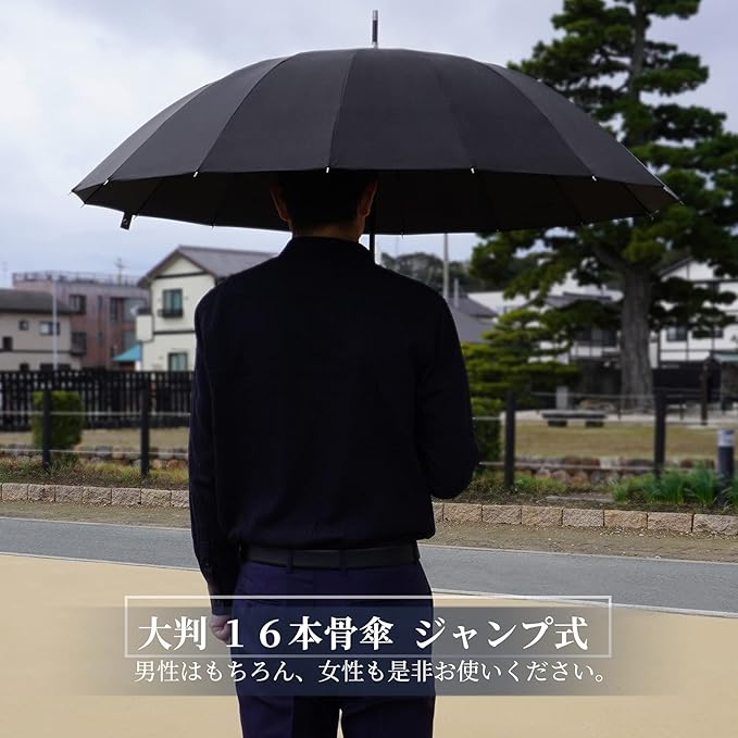 [16本骨 風に強い] 梅雨対策 傘 メンズ 長傘 大きい 頑丈 ワンタッチ ジャンプ式 撥水 丈夫 軽量 グラスファイバー 通学 通勤 収納ポーチ付き