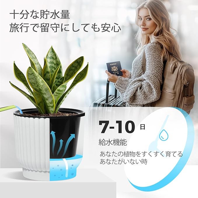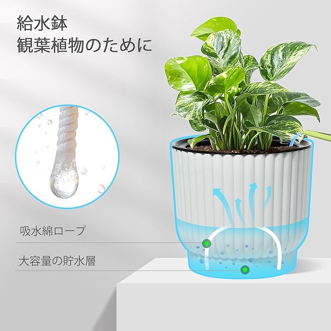 【自動給水機能付き】貯水層独特な設計で、植物根部分の水量と酸素量のバランスを保て、根を自由に呼吸させ、成長させます。紐で鉢底の水を吸収し、自動給水が実現させます。週に1-2回だけ水やり、大いに時間を節約します。出張や旅行に行っても植物は枯れるようになる心配が要りません。ですから、植物育成が好きなのに、普段植物の世話になる時間が少ない人や初心者さんへのベストチョイスです。