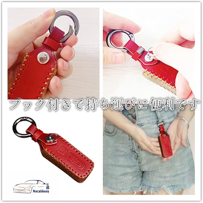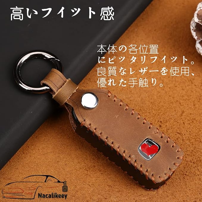 特徴 手作りレザーデザイン、多くの車種に対応、落下防止レザーキーホルダー付属
