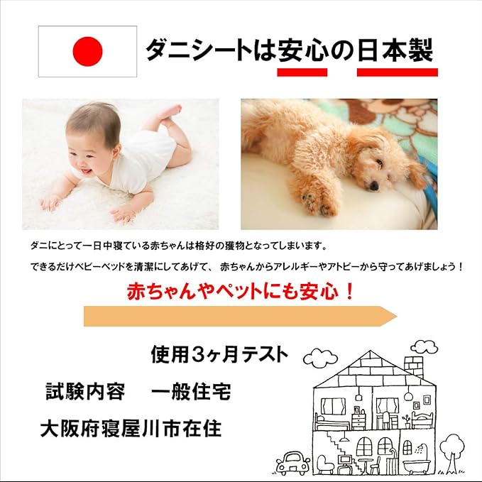 注意:お色味は選べません。製造段階で発生する規定基準をクリアしていないダニシートです。 正規品と同等に使えるのにもったいない事から、低価格でお客様に喜んでいただけたらと思いで、販売しております。 生地や縫製、サイズ感に正規商品とは異なりますが、使用効果に問題ございませんのでご安心してご使用ください。 ダニに刺されるととっても危険です!! ダニにいそうな気になる場所に置いておくだけカンタン!! 誘引剤は殺虫剤不使用なので赤ちゃんやペットにも安心です。 誘引剤に誘われたダニが粘着テープにくっつき捕獲するので死骸が飛び散らない! 強力粘着テープでダニを捕獲!フルーティな香りのマットタイプ 効力:開封後約3カ月 使用期限付きシール付き ダニ捕獲有効面積:1枚で2~3畳 ●設置方法について ダニは暗い場所を好みますので、光が当たらない場所が効果的です。 ●設置場所 カーペット、絨毯の下・ベッドや敷布団の下・押入れのお布団の間、クローゼットの中・ソファーとソファーカバーの間・車シートの下、ペットマットの下・玄関マットの下 等 布団の下に設置する場合は足元の方へ置いてください。 ※染色の関係で多少、生地色が異なる場合があります。 ※本商品はイエダニ、マダニは対象外です。 ・イエダニは、飲食店の入った雑居ビルに生息し、ネズミの血を餌にしています。 ・マダニは、森林や草むらに生息しています。ペットのお散歩にご注意ください。 ●使用後の処理について 商品は綿100%ですので、使用期限が終わりましたら一般家庭の燃えるゴミとして処理してください ●キーワード