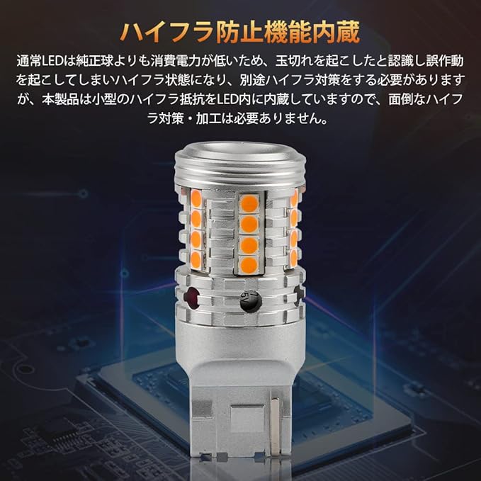 【ハイフラ防止機能内蔵】普通はウィンカー球をLEDに変更した際に、消費電力が違うにより、ウィンカーが高速点滅する事をハイフラ状態になりますが、本製品は小型のハイフラ抵抗をLED内に内蔵していますので、面倒なハイフラ対策・加工は必要ありません。ポン付けするだけでハイ