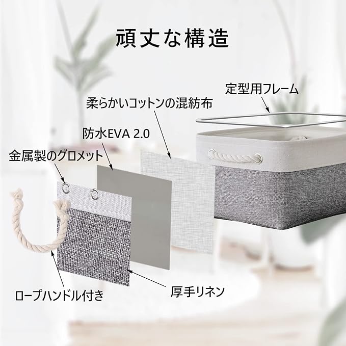 【高品質・耐久性】収納バスケットの外側はナチュラルな100%綿麻の素材を採用して、芯材は硬度があり防水できるの素材EVA2.0を使っており、内側には滑らかなポリエステル生地が付いており、高品質、高耐久性、防湿です。上部は金属フレームで固定され、形を保ち、変形を心配がなくて、安心してご使用いただけます。