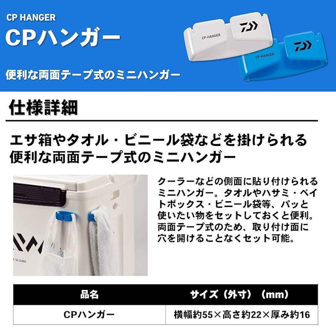 CPハンガー●取り付けの簡単な両面テープ付き。●エサ箱・ビニール袋・タオル・ハサミなど、パッと使いたい物をセットしておくと便利。※写真はハサミ・タオル・エサ箱の取り付け例です。