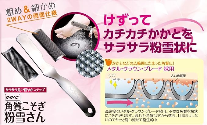 かかとなどの広範囲にたまった角質に使い、粗め、細かめの面を入れ替えられます。使い終わった後は分解可能で清潔に保てます。ご使用の際は、角質部を清潔な状態にしてからご使用ください。