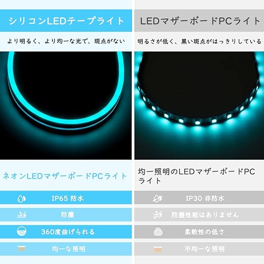 「高品質のテープライト」LEDネオンテープライトは、柔軟性のあるシリコンチューブを使用しているので、簡単に好きな形に曲げることができます。12V M/B LEDストリップは、より安定した出力が得られます。