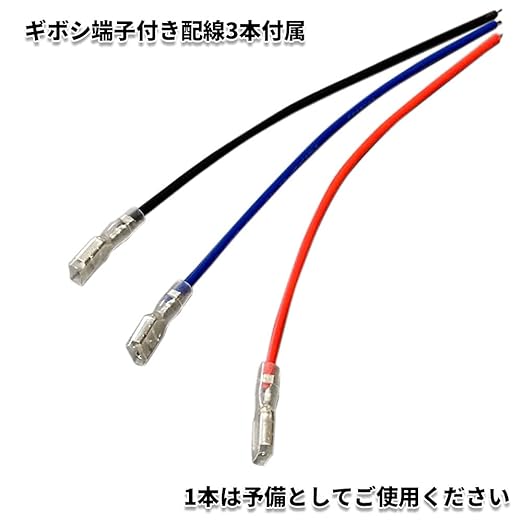 便利なギボシ端子付き配線が3本付属しています。1本は予備としてご使用ください。