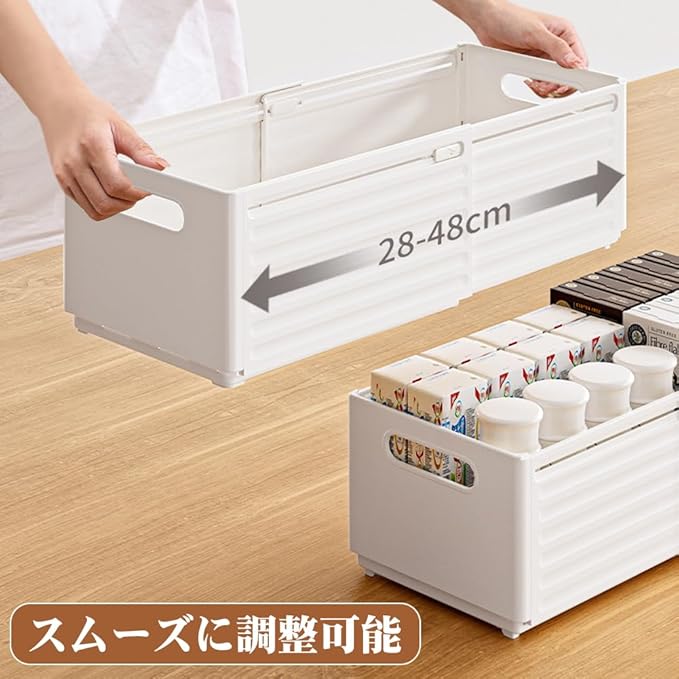 【自由に調整可能】収納ボックスはストッパー付き、サイズが自由に調整できます。最後まで伸縮しても外れません。スペースを最大限に活用します。