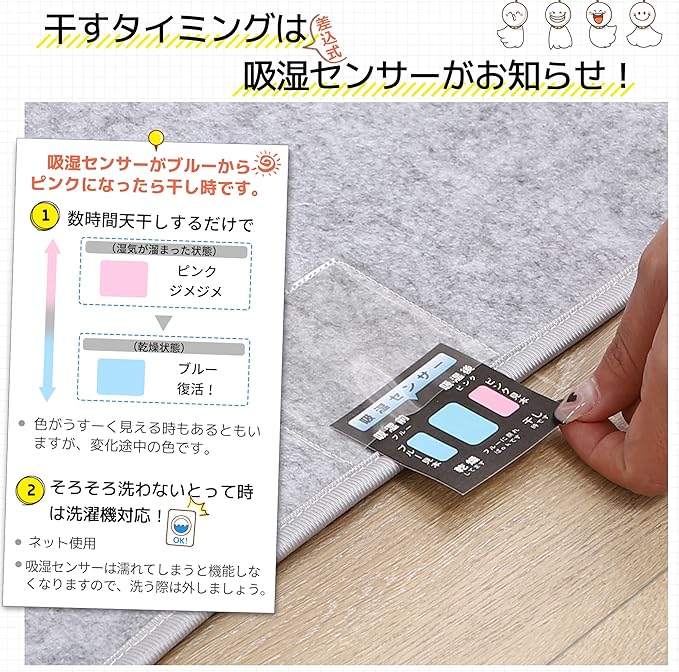 【洗える除湿シート・衛生的】寝汗が気になる季節はとくに除湿シートも何度も洗えたほうがうれしい! というお声もたくさん出ていますので、当店の除湿シートは水洗いに対応した素材を採用しまいました。「ネット使用で洗濯機可」の除湿シートなので、清潔面が気になる方はぜひご検討を。洗う際はセンサーを外してください。
