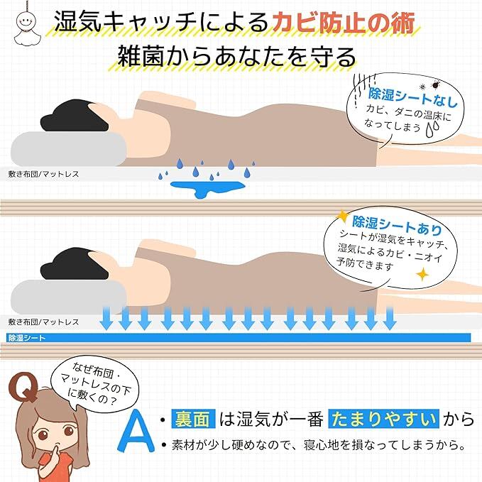 布団の下に除湿シートを敷くだけで、簡単に湿気退治。清潔でカラッとした気持ちのいい布団が一年中手に入ります