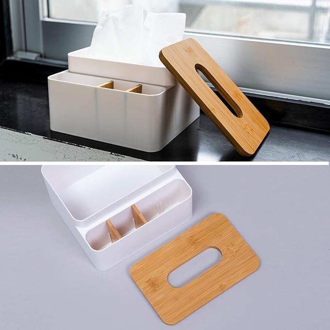 【小物も収納できるティッシュケース】:テーブルの上をスッキリまとめられる小物入れ付きのティッシュボックス。