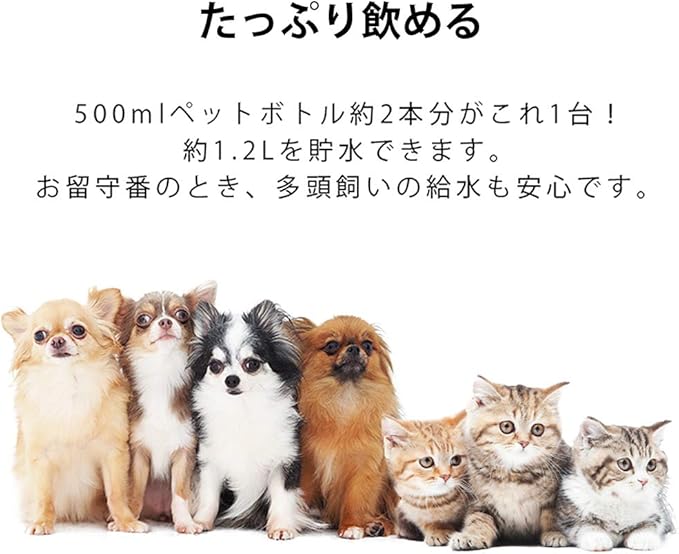 【他頭飼いに嬉しい貯水量】:1台でペットボトル2本分の貯水量。