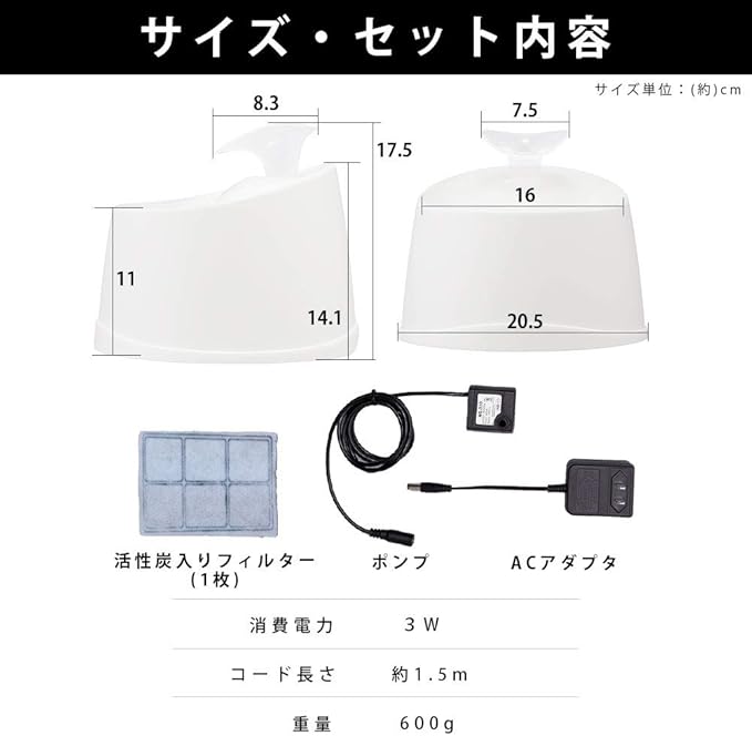 ※【Smart Basic】は、Amazon.co.jpで販売するアイリスのブランドです。いつでも新鮮なお水が飲める、ペット用自動給水機です。 循環システムが水中に酸素を取り込み新鮮でおいしいお水を維持します。 常に循環するので、お留守番でもきれいなお水が飲めます。 食べカス、被毛、埃などを取る活性炭入りのフィルター採用。 低消費電力で、経済的です。 アタッチメントを取りはずせるので、わんちゃん、猫ちゃんのサイズや好みに合わせることが出来ます。