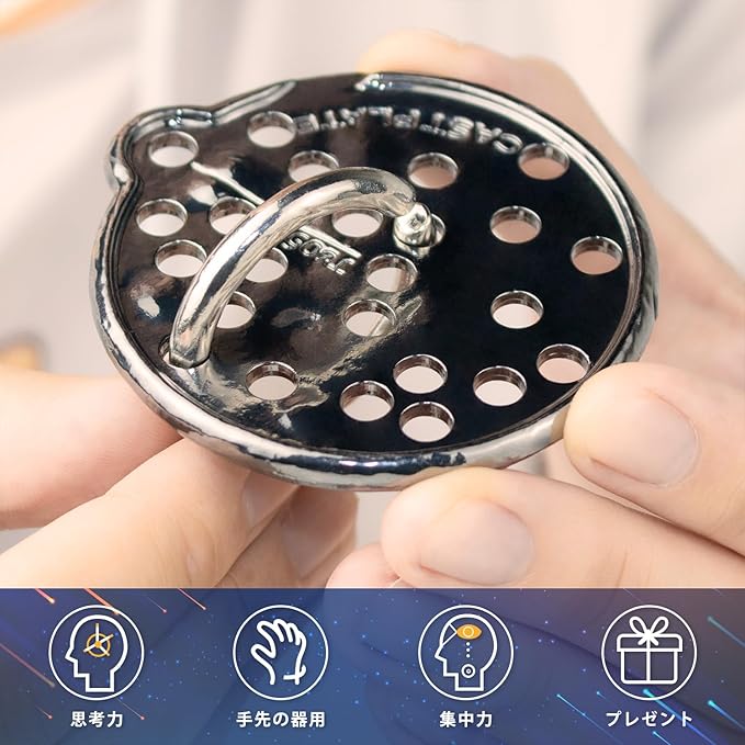 「頭と手を鍛える」知恵の輪を遊ぶには集中力や思考力が必要なため子どもの知育に役立つほか、大人の暇つぶしや頭の体操などにも適しています。ピースが複雑に絡まっている知恵の輪を解くには色々な角度からものごとを捉える力が必要なため、遊ぶほど発想力、思考力や手先の器用などの能力が伸びやすくなります。あと粘り強くパズルを解こうと考えるため、忍耐力や集中力も鍛えられます。そしてさらに、一度外したピースを元の形に戻して時間が経つともう一度解くに挑戦のようなことなど、一つの玩具で何度も楽しめる点もかなり魅力です。