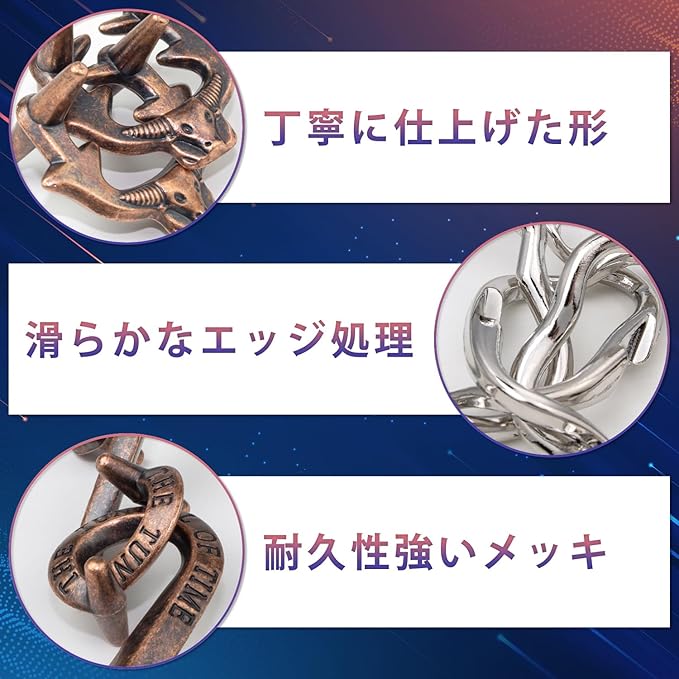 「丁寧な作り上げ」パーツを組み合わせて、知恵の輪おもちゃのデザインと適切な難易度を持ちながら、丈夫&丁寧に作ったステンレス製金属パーツに防錆性&耐食性強いメッキで仕上がります。しっかり頭で考えなければパズルを解けません。