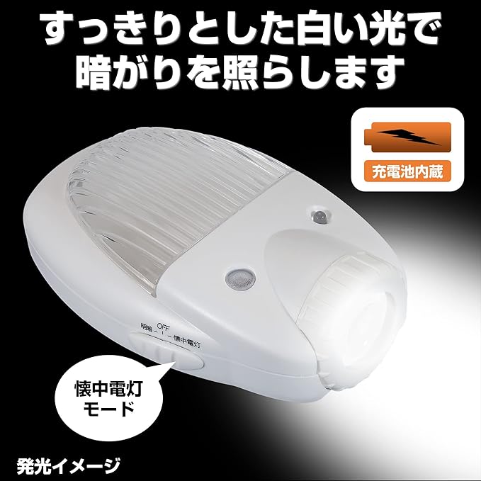 ■定格電圧:AC100V ■定格周波数:50Hz/60Hz ■定格消費電力:0.4W ■光源:白色LED/アンバー色LED ■全光束:明暗 2lm / 懐中電灯 5lm ■点灯開始照度:約5lx ■連続点灯時間:15時間以上充電で連続約4時間点灯(保安灯・懐中電灯) ■外形寸法(約):幅67 高さ107 厚さ37(mm)(最大値) ■質量:約101g ■屋内用
