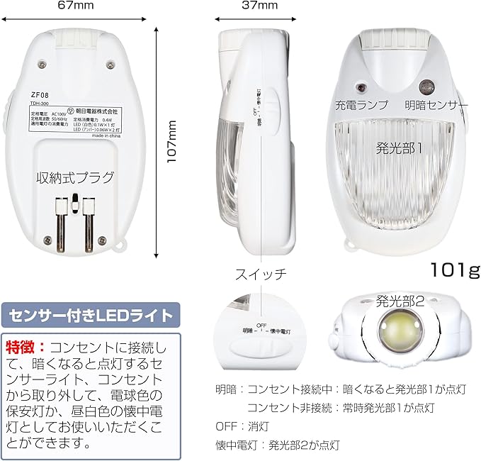 エルパ (ELPA) LEDセンサー付ライト (電球色/コンセント式) 明暗センサー/懐中電灯/保安灯 (TDH-300)
