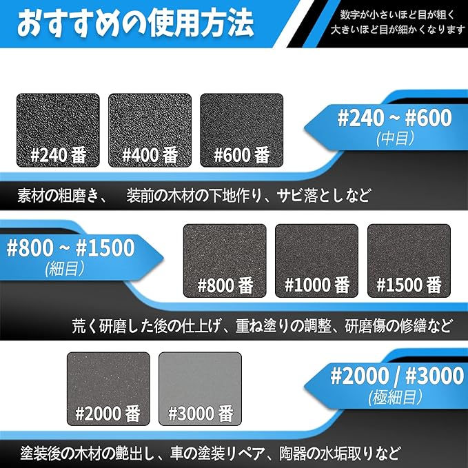 【DIYなら最高のセットです】ほとんどのニーズをカバーする砥粒、計81枚セット 下研ぎの荒目から仕上げの迄 各10枚 #240/#400/#600/#800/#1000/#1500/#2000/3000は面倒な磨き作業をつのセット+曲⾯⽤アダプターパッドx1,楽に作業が出来ました.IROKCAKPT紙やすりだけで完結させます 安くて種類もあ