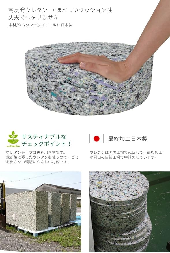 サスティナブルな取り組み/ウレタンチップは再利用素材です。裁断後に残ったウレタンを使うので、ゴミを出さない環境にやさしい材料です。