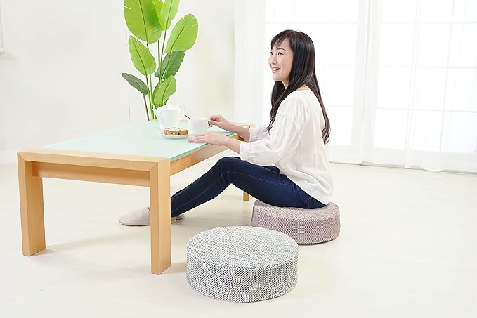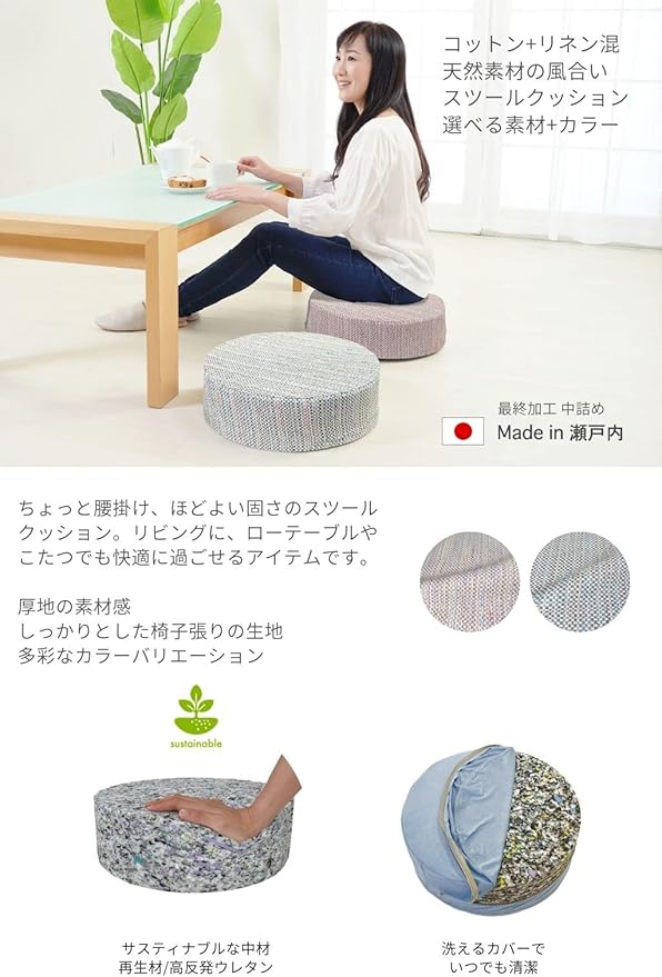 ちょっと腰掛け、ほどよい固さのスツールクッション。リビングや、ローテーブルやこたつでも快適に過ごせるアイテムです。スツールクッション直径40 12cm