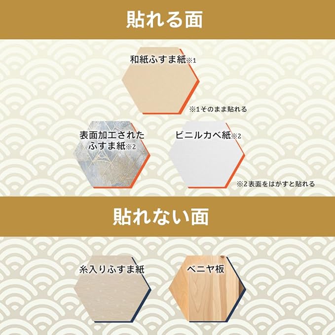 ※表面をはがすと貼れる面:表面加工されたふすま紙、ビニルカベ紙。