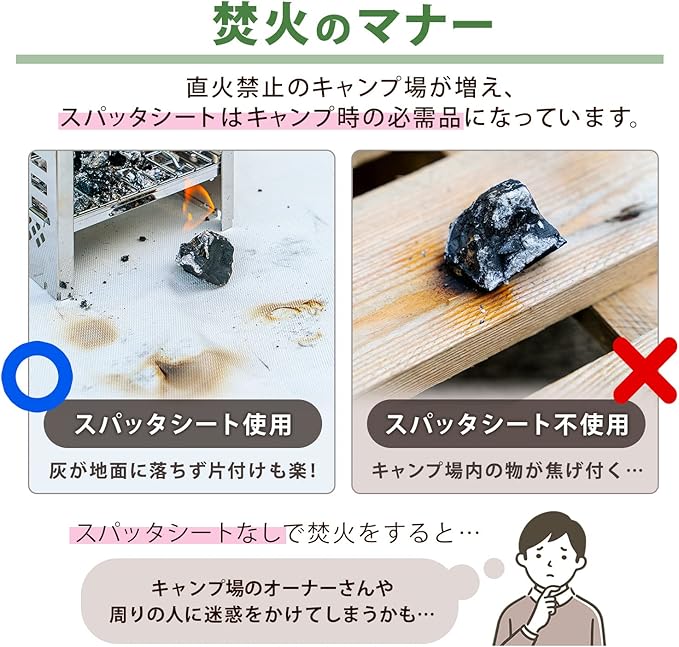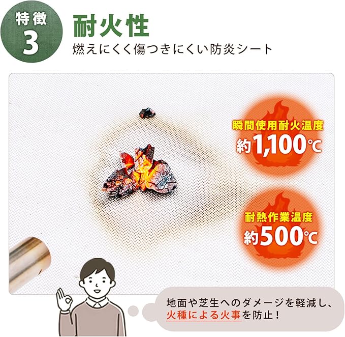 【火花養生にオススメ】:キャンプやバーベキュー際に焚き火台の下に敷いておくと芝生や地面を保護し、後片付けもラクラク。