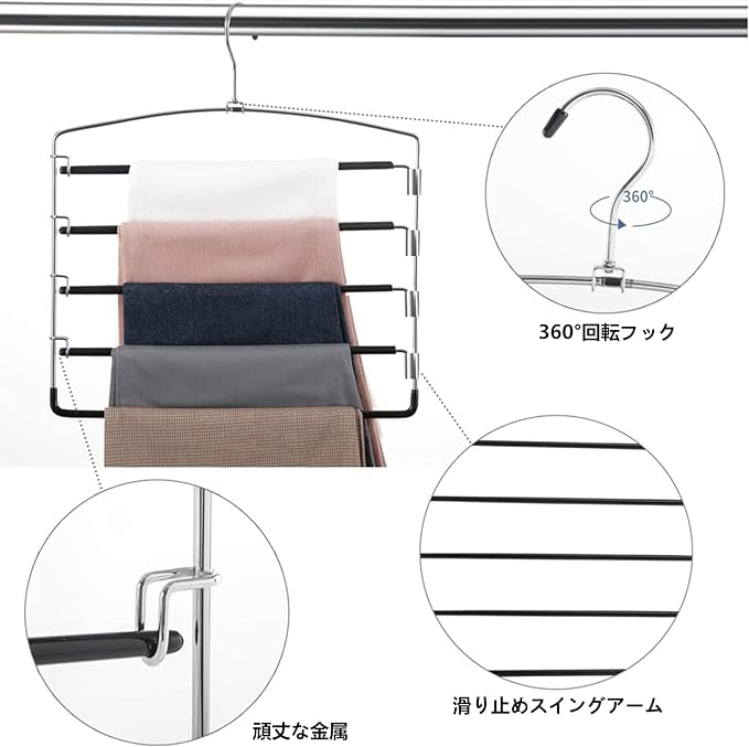 2本 ズボンハンガー 5段 スラックスハンガー クローゼット収納 コネクター すべらない 360 回転 ステンレスハンガー 跡がつかない 省スペース ズボンスラックス ジーンズ スカート ノンスリップ 家庭 押し入れ収納