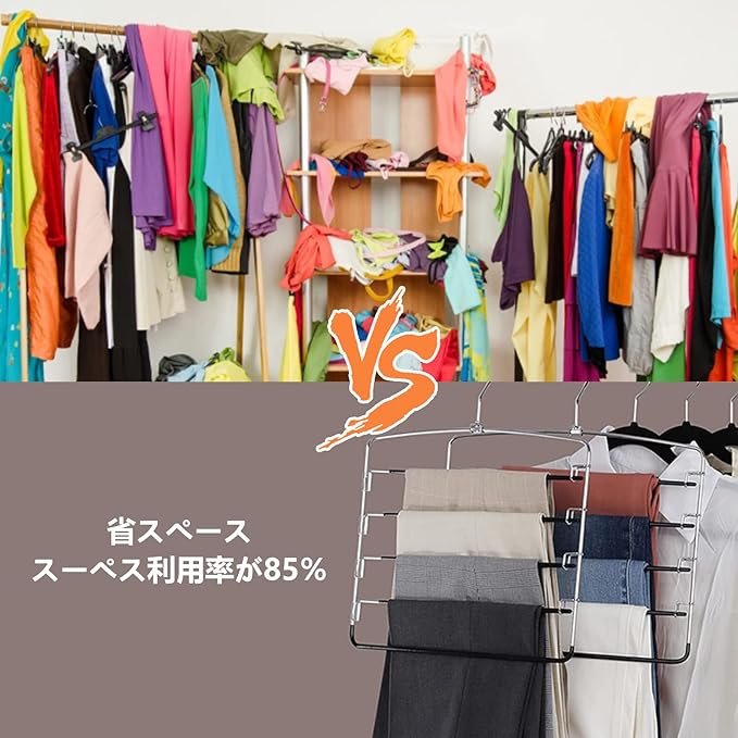 【多機能ズボンハンガー】ハンガーで収納のスペースを有効活用し、きれいに整理整頓することができます。 5層あるこのマルチハンガーはズボンだけでなく、スカート、ジーンズ、マフラー、タオルなど様々な物を収納していただけます。更にスカーフ、ベルト、ネクタイなどの小物にも対応可能でアイディア次第で使い道が広がります。