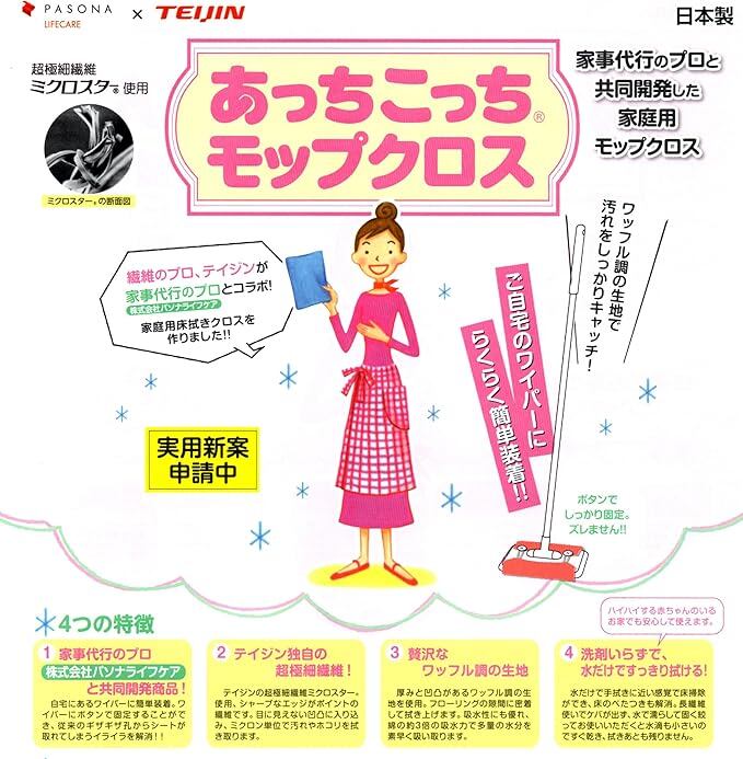 ご家庭のワイパーにらくらく簡単装着【特長】・従来の家庭用のワイパーに装着でき、両面使うことができるリバーシブル仕様のモップクロスです。・超極細繊維ミクロスターを使用した厚みと凹凸のあるワッフル状の生地が、ミクロン単位でホコリを拭き取ります。・取り付けはボタン式にし、お掃除途中でクロスが外れてしまう悩みをなくしました!・水だけで手拭きに近い感覚の床掃除ができ、ハイハイする赤ちゃんやペットのいるご家庭でも安心。・長繊維なのでケバも出ず拭き後スッキリ♪