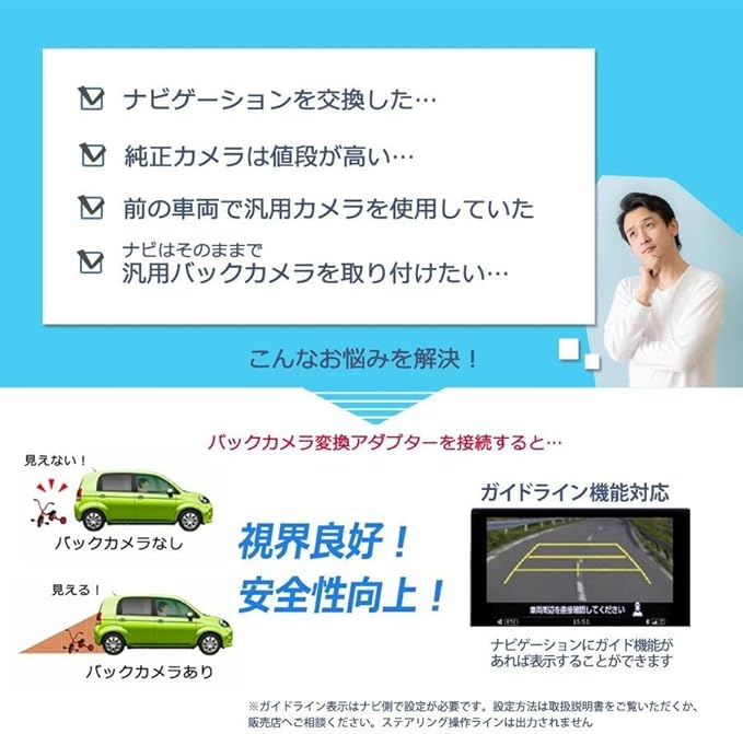 動作は純正品同様ナビ本体にリバース信号が入力されれば画面は自動的に切り替えられます。 (カメラの電源の接続等は使用するカメラの各メーカー様の取付指示に従ってください。)
