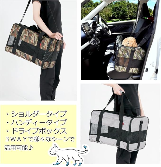 持ち運びも便利、肩にかけられる。車に簡単に装着でカーボックスに変身できる3Wayタイプ。お出かけ、旅行、病院通いにピッタリの商品。収納に場所をとらない折り畳み式。内部には便利なストラップが付いている。風通しの良いメッシュの上部トビラと側面のメッシュ小窓で中の様子を確認できる。推奨体重目安:4.5kg以下 ※体重目安以外に商品の内寸サイズを必ずご確認いただきます様お願い致します。