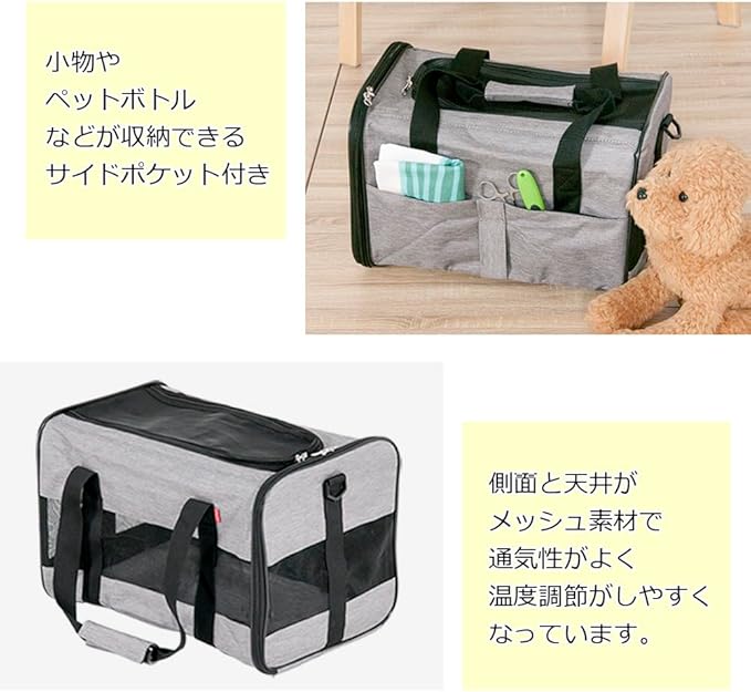 プチリュバン ペットキャリー 猫 犬 Mサイズ グレー 折りたたみ式 3WAY ダブルドア 小型犬 小動物 ドライブボックス キャリーバッグ シートベルト固定可 4面メッシュ ショルダー 手提げ