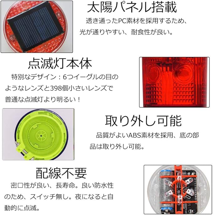 【電気代不要・配線不要・省エネルギー】ソーラータイプなので、太陽電池が搭載、光エネルギーで駆動。配線は不要で、電気代もかからず安心して使いできます。昼間にはソーラーエネルギで自動充電し、点滅しない。夜になると自動的に点滅します。