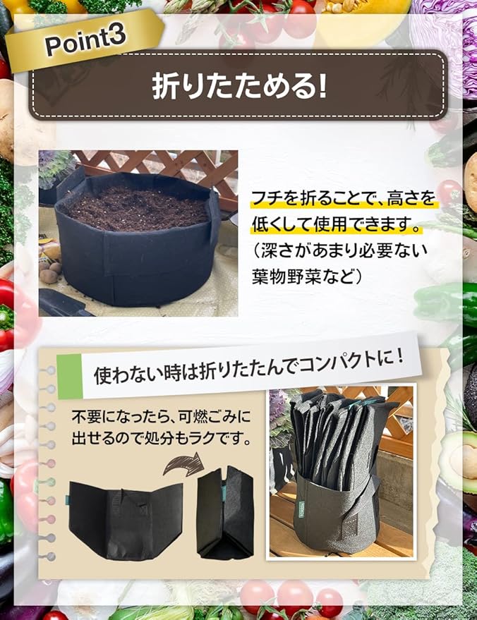 ・幅34cm 高さ30cm(7ガロン) 2個入り ・入る土の量:約27リットル ※折り畳んだ状態でのお届けとなります。シワがついていますが、使用していくうちに目立たなくなりますのでご了承願います。