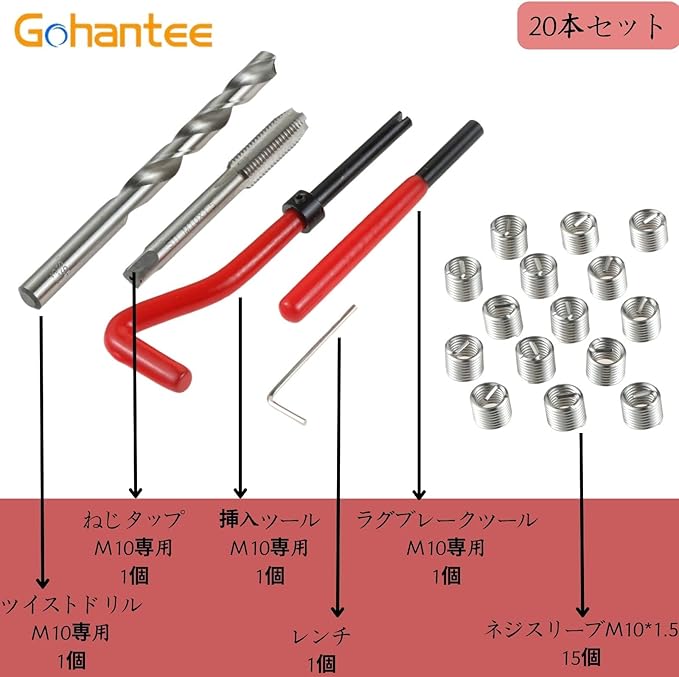 【20個セット内容】M10ネジスリーブ(ヘリサート) 15枚+挿入ツール 1枚+ラグブレークツール 1枚+ツイストドリル10.3mm 1枚+ねじタップM10 1枚+小型レンチ 1枚