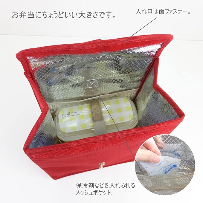 開け口は面ファスナー仕様で大きく開き、お弁当の出し入れも楽に出来ます。お弁当の大きさによって調節できる、ホック仕様。小さめのお弁当の時は、ホックで留めてコンパクトに。内側には保冷剤も入れられるメッシュポケットがついています。