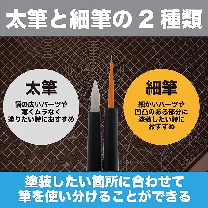 太筆と細筆の2種類:幅の広いパーツに塗装したい時や薄くムラなく塗りたい時におすすめの太筆と、細かいパーツや凹凸のある部分に塗装したい時におすすめの細筆の2種類が揃ったセット品となっています。塗装したい箇所に合わせて筆を使い分けることが可能です。