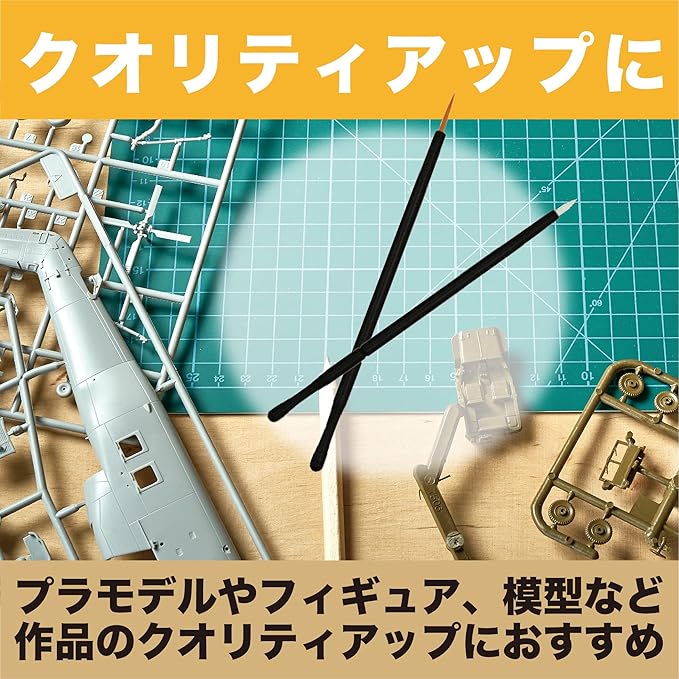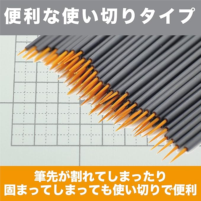 プラモデルの塗装にピッタリの筆セット:プラモデルや模型などの塗装をしたい場合にピッタリの塗装筆のセットです。使い切りタイプの筆なので、筆先が割れてしまったり、固まってしまった時はすぐに交換して、作業を続けることができます。